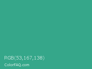 RGB 53,167,138 Color is a normal cyan color and the nearest color is Zomp #39a78e. Hex code #35a78a and RGB value is rgb(53,167,138). In RGB color space, this color is composed of 21% red, 65% green, 54% blue, In CMYK color space, this color is composed of 68% cyan, 0% magenta, 17% yellow , 35% black , In HSL color space, this color has a hue angle of 165° , 52% saturation and 43% lightness.