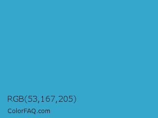 RGB 53,167,205 Color is a normal blue color and the nearest color is Pelorous #3eabbf. Hex code #35a7cd and RGB value is rgb(53,167,205). In RGB color space, this color is composed of 21% red, 65% green, 80% blue, In CMYK color space, this color is composed of 74% cyan, 19% magenta, 0% yellow , 20% black , In HSL color space, this color has a hue angle of 195° , 60% saturation and 51% lightness.