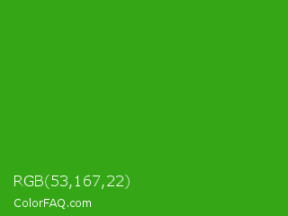 RGB 53,167,22 Color is a normal green color and the nearest color is Slimy Green #299617. Hex code #35a716 and RGB value is rgb(53,167,22). In RGB color space, this color is composed of 21% red, 65% green, 9% blue, In CMYK color space, this color is composed of 68% cyan, 0% magenta, 87% yellow , 35% black , In HSL color space, this color has a hue angle of 107° , 77% saturation and 37% lightness.