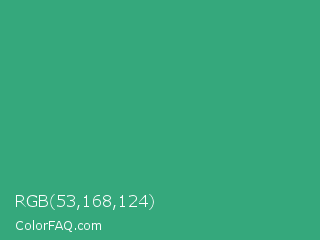 RGB 53,168,124 Color is a normal green color and the nearest color is Ocean Green #41aa78. Hex code #35a87c and RGB value is rgb(53,168,124). In RGB color space, this color is composed of 21% red, 66% green, 49% blue, In CMYK color space, this color is composed of 68% cyan, 0% magenta, 26% yellow , 34% black , In HSL color space, this color has a hue angle of 157° , 52% saturation and 43% lightness.