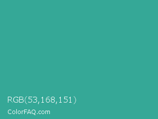 RGB 53,168,151 Color is a normal cyan color and the nearest color is Zomp #39a78e. Hex code #35a897 and RGB value is rgb(53,168,151). In RGB color space, this color is composed of 21% red, 66% green, 59% blue, In CMYK color space, this color is composed of 68% cyan, 0% magenta, 10% yellow , 34% black , In HSL color space, this color has a hue angle of 171° , 52% saturation and 43% lightness.