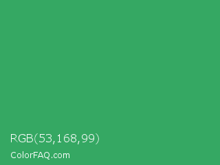 RGB 53,168,99 Color is a normal green color and the nearest color is Chateau Green #40a860. Hex code #35a863 and RGB value is rgb(53,168,99). In RGB color space, this color is composed of 21% red, 66% green, 39% blue, In CMYK color space, this color is composed of 68% cyan, 0% magenta, 41% yellow , 34% black , In HSL color space, this color has a hue angle of 144° , 52% saturation and 43% lightness.