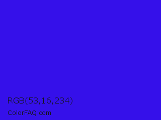RGB 53,16,234 Color is a normal indigo color and the nearest color is Electric Ultramarine #3f00ff. Hex code #3510ea and RGB value is rgb(53,16,234). In RGB color space, this color is composed of 21% red, 6% green, 92% blue, In CMYK color space, this color is composed of 77% cyan, 93% magenta, 0% yellow , 8% black , In HSL color space, this color has a hue angle of 250° , 87% saturation and 49% lightness.