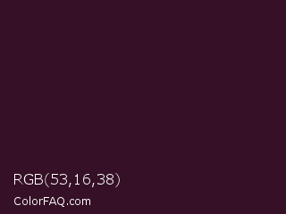 RGB 53,16,38 Color is a very dark magenta color and the nearest color is Melanzane #300529. Hex code #351026 and RGB value is rgb(53,16,38). In RGB color space, this color is composed of 21% red, 6% green, 15% blue, In CMYK color space, this color is composed of 0% cyan, 70% magenta, 28% yellow , 79% black , In HSL color space, this color has a hue angle of 324° , 54% saturation and 14% lightness.