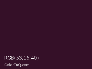 RGB 53,16,40 Color is a very dark magenta color and the nearest color is Melanzane #300529. Hex code #351028 and RGB value is rgb(53,16,40). In RGB color space, this color is composed of 21% red, 6% green, 16% blue, In CMYK color space, this color is composed of 0% cyan, 70% magenta, 25% yellow , 79% black , In HSL color space, this color has a hue angle of 321° , 54% saturation and 14% lightness.