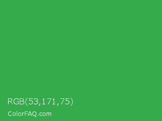 RGB 53,171,75 Color is a normal green color and the nearest color is Chateau Green #40a860. Hex code #35ab4b and RGB value is rgb(53,171,75). In RGB color space, this color is composed of 21% red, 67% green, 29% blue, In CMYK color space, this color is composed of 69% cyan, 0% magenta, 56% yellow , 33% black , In HSL color space, this color has a hue angle of 131° , 53% saturation and 44% lightness.