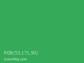 RGB 53,171,90 Color is a normal green color and the nearest color is Chateau Green #40a860. Hex code #35ab5a and RGB value is rgb(53,171,90). In RGB color space, this color is composed of 21% red, 67% green, 35% blue, In CMYK color space, this color is composed of 69% cyan, 0% magenta, 47% yellow , 33% black , In HSL color space, this color has a hue angle of 139° , 53% saturation and 44% lightness.