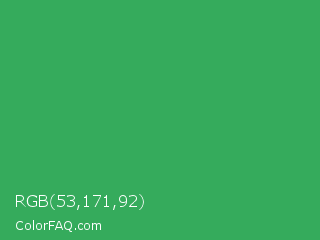 RGB 53,171,92 Color is a normal green color and the nearest color is Chateau Green #40a860. Hex code #35ab5c and RGB value is rgb(53,171,92). In RGB color space, this color is composed of 21% red, 67% green, 36% blue, In CMYK color space, this color is composed of 69% cyan, 0% magenta, 46% yellow , 33% black , In HSL color space, this color has a hue angle of 140° , 53% saturation and 44% lightness.