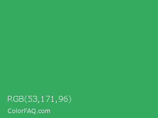 RGB 53,171,96 Color is a normal green color and the nearest color is Chateau Green #40a860. Hex code #35ab60 and RGB value is rgb(53,171,96). In RGB color space, this color is composed of 21% red, 67% green, 38% blue, In CMYK color space, this color is composed of 69% cyan, 0% magenta, 44% yellow , 33% black , In HSL color space, this color has a hue angle of 142° , 53% saturation and 44% lightness.