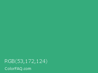 RGB 53,172,124 Color is a normal green color and the nearest color is Ocean Green #41aa78. Hex code #35ac7c and RGB value is rgb(53,172,124). In RGB color space, this color is composed of 21% red, 67% green, 49% blue, In CMYK color space, this color is composed of 69% cyan, 0% magenta, 28% yellow , 33% black , In HSL color space, this color has a hue angle of 156° , 53% saturation and 44% lightness.