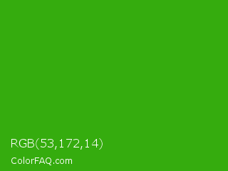 RGB 53,172,14 Color is a normal green color and the nearest color is Slimy Green #299617. Hex code #35ac0e and RGB value is rgb(53,172,14). In RGB color space, this color is composed of 21% red, 67% green, 5% blue, In CMYK color space, this color is composed of 69% cyan, 0% magenta, 92% yellow , 33% black , In HSL color space, this color has a hue angle of 105° , 85% saturation and 36% lightness.
