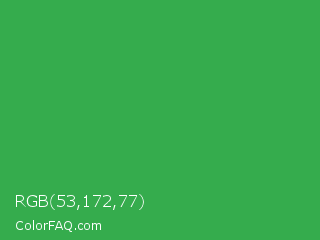 RGB 53,172,77 Color is a normal green color and the nearest color is Chateau Green #40a860. Hex code #35ac4d and RGB value is rgb(53,172,77). In RGB color space, this color is composed of 21% red, 67% green, 30% blue, In CMYK color space, this color is composed of 69% cyan, 0% magenta, 55% yellow , 33% black , In HSL color space, this color has a hue angle of 132° , 53% saturation and 44% lightness.
