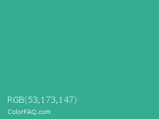 RGB 53,173,147 Color is a normal cyan color and the nearest color is Zomp #39a78e. Hex code #35ad93 and RGB value is rgb(53,173,147). In RGB color space, this color is composed of 21% red, 68% green, 58% blue, In CMYK color space, this color is composed of 69% cyan, 0% magenta, 15% yellow , 32% black , In HSL color space, this color has a hue angle of 167° , 53% saturation and 44% lightness.