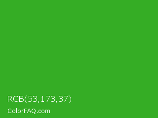 RGB 53,173,37 Color is a normal green color and the nearest color is Wageningen Green #34b233. Hex code #35ad25 and RGB value is rgb(53,173,37). In RGB color space, this color is composed of 21% red, 68% green, 15% blue, In CMYK color space, this color is composed of 69% cyan, 0% magenta, 79% yellow , 32% black , In HSL color space, this color has a hue angle of 113° , 65% saturation and 41% lightness.