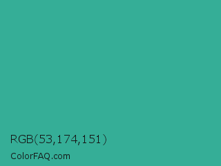 RGB 53,174,151 Color is a normal cyan color and the nearest color is Keppel #3ab09e. Hex code #35ae97 and RGB value is rgb(53,174,151). In RGB color space, this color is composed of 21% red, 68% green, 59% blue, In CMYK color space, this color is composed of 70% cyan, 0% magenta, 13% yellow , 32% black , In HSL color space, this color has a hue angle of 169° , 53% saturation and 45% lightness.