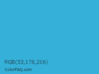 RGB 53,176,216 Color is a normal blue color and the nearest color is Scooter #2ebfd4. Hex code #35b0d8 and RGB value is rgb(53,176,216). In RGB color space, this color is composed of 21% red, 69% green, 85% blue, In CMYK color space, this color is composed of 75% cyan, 19% magenta, 0% yellow , 15% black , In HSL color space, this color has a hue angle of 195° , 68% saturation and 53% lightness.