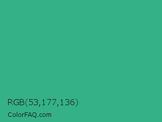 RGB 53,177,136 Color is a normal green color and the nearest color is Mint #3eb489. Hex code #35b188 and RGB value is rgb(53,177,136). In RGB color space, this color is composed of 21% red, 69% green, 53% blue, In CMYK color space, this color is composed of 70% cyan, 0% magenta, 23% yellow , 31% black , In HSL color space, this color has a hue angle of 160° , 54% saturation and 45% lightness.
