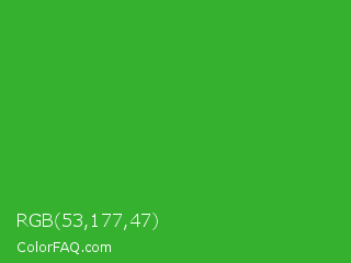 RGB 53,177,47 Color is a normal green color and the nearest color is Wageningen Green #34b233. Hex code #35b12f and RGB value is rgb(53,177,47). In RGB color space, this color is composed of 21% red, 69% green, 18% blue, In CMYK color space, this color is composed of 70% cyan, 0% magenta, 73% yellow , 31% black , In HSL color space, this color has a hue angle of 117° , 58% saturation and 44% lightness.