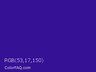 RGB 53,17,150 Color is a normal indigo color and the nearest color is Blue Gem #2c0e8c. Hex code #351196 and RGB value is rgb(53,17,150). In RGB color space, this color is composed of 21% red, 7% green, 59% blue, In CMYK color space, this color is composed of 65% cyan, 89% magenta, 0% yellow , 41% black , In HSL color space, this color has a hue angle of 256° , 80% saturation and 33% lightness.