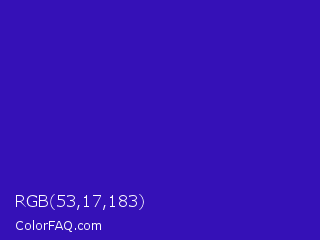 RGB 53,17,183 Color is a normal indigo color and the nearest color is Interdimensional Blue #360ccc. Hex code #3511b7 and RGB value is rgb(53,17,183). In RGB color space, this color is composed of 21% red, 7% green, 72% blue, In CMYK color space, this color is composed of 71% cyan, 91% magenta, 0% yellow , 28% black , In HSL color space, this color has a hue angle of 253° , 83% saturation and 39% lightness.