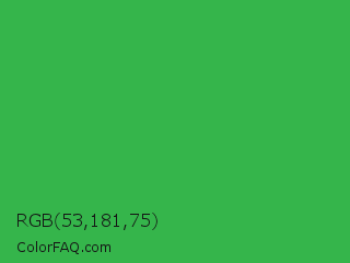 RGB 53,181,75 Color is a normal green color and the nearest color is Wageningen Green #34b233. Hex code #35b54b and RGB value is rgb(53,181,75). In RGB color space, this color is composed of 21% red, 71% green, 29% blue, In CMYK color space, this color is composed of 71% cyan, 0% magenta, 59% yellow , 29% black , In HSL color space, this color has a hue angle of 130° , 55% saturation and 46% lightness.
