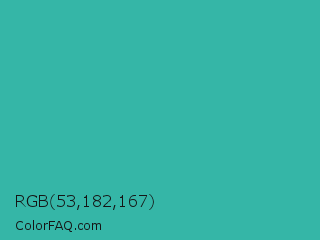 RGB 53,182,167 Color is a normal cyan color and the nearest color is Keppel #3ab09e. Hex code #35b6a7 and RGB value is rgb(53,182,167). In RGB color space, this color is composed of 21% red, 71% green, 65% blue, In CMYK color space, this color is composed of 71% cyan, 0% magenta, 8% yellow , 29% black , In HSL color space, this color has a hue angle of 173° , 55% saturation and 46% lightness.