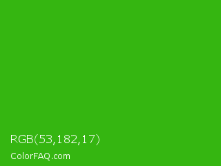 RGB 53,182,17 Color is a normal green color and the nearest color is Kelly Green #4cbb17. Hex code #35b611 and RGB value is rgb(53,182,17). In RGB color space, this color is composed of 21% red, 71% green, 7% blue, In CMYK color space, this color is composed of 71% cyan, 0% magenta, 91% yellow , 29% black , In HSL color space, this color has a hue angle of 107° , 83% saturation and 39% lightness.