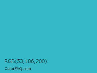RGB 53,186,200 Color is a normal cyan color and the nearest color is Maximum Blue Green #30bfbf. Hex code #35bac8 and RGB value is rgb(53,186,200). In RGB color space, this color is composed of 21% red, 73% green, 78% blue, In CMYK color space, this color is composed of 74% cyan, 7% magenta, 0% yellow , 22% black , In HSL color space, this color has a hue angle of 186° , 58% saturation and 50% lightness.