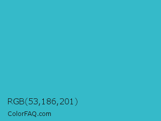 RGB 53,186,201 Color is a normal cyan color and the nearest color is Maximum Blue Green #30bfbf. Hex code #35bac9 and RGB value is rgb(53,186,201). In RGB color space, this color is composed of 21% red, 73% green, 79% blue, In CMYK color space, this color is composed of 74% cyan, 7% magenta, 0% yellow , 21% black , In HSL color space, this color has a hue angle of 186° , 58% saturation and 50% lightness.