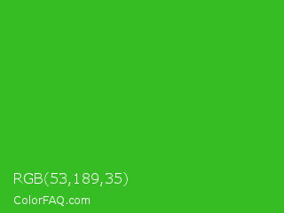 RGB 53,189,35 Color is a normal green color and the nearest color is Wageningen Green #34b233. Hex code #35bd23 and RGB value is rgb(53,189,35). In RGB color space, this color is composed of 21% red, 74% green, 14% blue, In CMYK color space, this color is composed of 72% cyan, 0% magenta, 81% yellow , 26% black , In HSL color space, this color has a hue angle of 113° , 69% saturation and 44% lightness.
