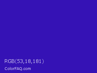 RGB 53,18,181 Color is a normal indigo color and the nearest color is Interdimensional Blue #360ccc. Hex code #3512b5 and RGB value is rgb(53,18,181). In RGB color space, this color is composed of 21% red, 7% green, 71% blue, In CMYK color space, this color is composed of 71% cyan, 90% magenta, 0% yellow , 29% black , In HSL color space, this color has a hue angle of 253° , 82% saturation and 39% lightness.