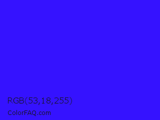RGB 53,18,255 Color is a normal indigo color and the nearest color is Electric Ultramarine #3f00ff. Hex code #3512ff and RGB value is rgb(53,18,255). In RGB color space, this color is composed of 21% red, 7% green, 100% blue, In CMYK color space, this color is composed of 79% cyan, 93% magenta, 0% yellow , 0% black , In HSL color space, this color has a hue angle of 249° , 100% saturation and 54% lightness.