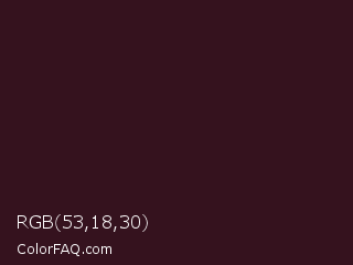 RGB 53,18,30 Color is a very dark rose color and the nearest color is Tamarind #341515. Hex code #35121e and RGB value is rgb(53,18,30). In RGB color space, this color is composed of 21% red, 7% green, 12% blue, In CMYK color space, this color is composed of 0% cyan, 66% magenta, 43% yellow , 79% black , In HSL color space, this color has a hue angle of 339° , 49% saturation and 14% lightness.
