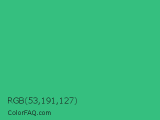 RGB 53,191,127 Color is a normal green color and the nearest color is Mint #3eb489. Hex code #35bf7f and RGB value is rgb(53,191,127). In RGB color space, this color is composed of 21% red, 75% green, 50% blue, In CMYK color space, this color is composed of 72% cyan, 0% magenta, 34% yellow , 25% black , In HSL color space, this color has a hue angle of 152° , 57% saturation and 48% lightness.