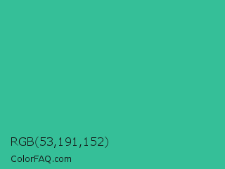RGB 53,191,152 Color is a normal green color and the nearest color is Mountain Meadow #30ba8f. Hex code #35bf98 and RGB value is rgb(53,191,152). In RGB color space, this color is composed of 21% red, 75% green, 60% blue, In CMYK color space, this color is composed of 72% cyan, 0% magenta, 20% yellow , 25% black , In HSL color space, this color has a hue angle of 163° , 57% saturation and 48% lightness.
