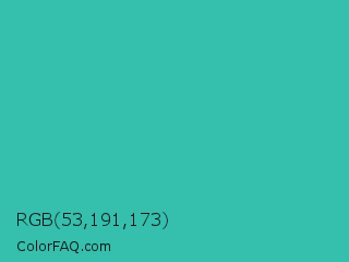 RGB 53,191,173 Color is a normal cyan color and the nearest color is Puerto Rico #3fc1aa. Hex code #35bfad and RGB value is rgb(53,191,173). In RGB color space, this color is composed of 21% red, 75% green, 68% blue, In CMYK color space, this color is composed of 72% cyan, 0% magenta, 9% yellow , 25% black , In HSL color space, this color has a hue angle of 172° , 57% saturation and 48% lightness.