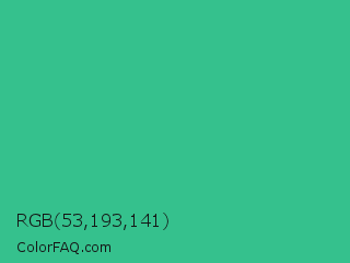 RGB 53,193,141 Color is a normal green color and the nearest color is Mountain Meadow #30ba8f. Hex code #35c18d and RGB value is rgb(53,193,141). In RGB color space, this color is composed of 21% red, 76% green, 55% blue, In CMYK color space, this color is composed of 73% cyan, 0% magenta, 27% yellow , 24% black , In HSL color space, this color has a hue angle of 158° , 57% saturation and 48% lightness.