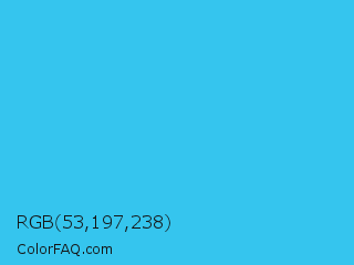 RGB 53,197,238 Color is a normal cyan color and the nearest color is Picton Blue #45b1e8. Hex code #35c5ee and RGB value is rgb(53,197,238). In RGB color space, this color is composed of 21% red, 77% green, 93% blue, In CMYK color space, this color is composed of 78% cyan, 17% magenta, 0% yellow , 7% black , In HSL color space, this color has a hue angle of 193° , 84% saturation and 57% lightness.