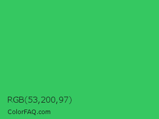 RGB 53,200,97 Color is a normal green color and the nearest color is UFO Green #3cd070. Hex code #35c861 and RGB value is rgb(53,200,97). In RGB color space, this color is composed of 21% red, 78% green, 38% blue, In CMYK color space, this color is composed of 74% cyan, 0% magenta, 52% yellow , 22% black , In HSL color space, this color has a hue angle of 138° , 58% saturation and 50% lightness.
