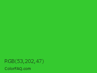 RGB 53,202,47 Color is a normal green color and the nearest color is Lime Green #32cd32. Hex code #35ca2f and RGB value is rgb(53,202,47). In RGB color space, this color is composed of 21% red, 79% green, 18% blue, In CMYK color space, this color is composed of 74% cyan, 0% magenta, 77% yellow , 21% black , In HSL color space, this color has a hue angle of 118° , 62% saturation and 49% lightness.