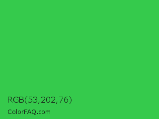 RGB 53,202,76 Color is a normal green color and the nearest color is Lime Green #32cd32. Hex code #35ca4c and RGB value is rgb(53,202,76). In RGB color space, this color is composed of 21% red, 79% green, 30% blue, In CMYK color space, this color is composed of 74% cyan, 0% magenta, 62% yellow , 21% black , In HSL color space, this color has a hue angle of 129° , 58% saturation and 50% lightness.