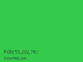 RGB 53,202,78 Color is a normal green color and the nearest color is Lime Green #32cd32. Hex code #35ca4e and RGB value is rgb(53,202,78). In RGB color space, this color is composed of 21% red, 79% green, 31% blue, In CMYK color space, this color is composed of 74% cyan, 0% magenta, 61% yellow , 21% black , In HSL color space, this color has a hue angle of 130° , 58% saturation and 50% lightness.