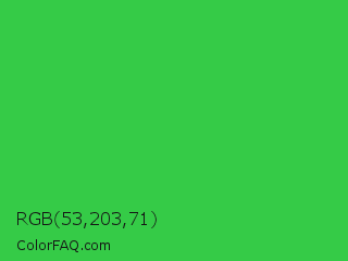 RGB 53,203,71 Color is a normal green color and the nearest color is Lime Green #32cd32. Hex code #35cb47 and RGB value is rgb(53,203,71). In RGB color space, this color is composed of 21% red, 80% green, 28% blue, In CMYK color space, this color is composed of 74% cyan, 0% magenta, 65% yellow , 20% black , In HSL color space, this color has a hue angle of 127° , 59% saturation and 50% lightness.