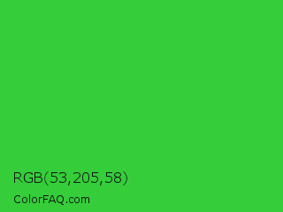 RGB 53,205,58 Color is a normal green color and the nearest color is Lime Green #32cd32. Hex code #35cd3a and RGB value is rgb(53,205,58). In RGB color space, this color is composed of 21% red, 80% green, 23% blue, In CMYK color space, this color is composed of 74% cyan, 0% magenta, 72% yellow , 20% black , In HSL color space, this color has a hue angle of 122° , 60% saturation and 51% lightness.