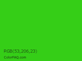 RGB 53,206,23 Color is a normal green color and the nearest color is Harlequin Green #46cb18. Hex code #35ce17 and RGB value is rgb(53,206,23). In RGB color space, this color is composed of 21% red, 81% green, 9% blue, In CMYK color space, this color is composed of 74% cyan, 0% magenta, 89% yellow , 19% black , In HSL color space, this color has a hue angle of 110° , 80% saturation and 45% lightness.