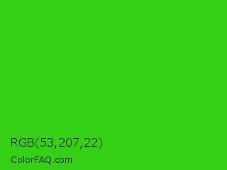 RGB 53,207,22 Color is a normal green color and the nearest color is Harlequin Green #46cb18. Hex code #35cf16 and RGB value is rgb(53,207,22). In RGB color space, this color is composed of 21% red, 81% green, 9% blue, In CMYK color space, this color is composed of 74% cyan, 0% magenta, 89% yellow , 19% black , In HSL color space, this color has a hue angle of 110° , 81% saturation and 45% lightness.