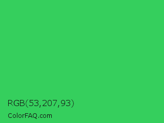 RGB 53,207,93 Color is a normal green color and the nearest color is UFO Green #3cd070. Hex code #35cf5d and RGB value is rgb(53,207,93). In RGB color space, this color is composed of 21% red, 81% green, 36% blue, In CMYK color space, this color is composed of 74% cyan, 0% magenta, 55% yellow , 19% black , In HSL color space, this color has a hue angle of 136° , 62% saturation and 51% lightness.