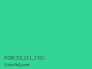 RGB 53,211,150 Color is a normal green color and the nearest color is Shamrock #33cc99. Hex code #35d396 and RGB value is rgb(53,211,150). In RGB color space, this color is composed of 21% red, 83% green, 59% blue, In CMYK color space, this color is composed of 75% cyan, 0% magenta, 29% yellow , 17% black , In HSL color space, this color has a hue angle of 157° , 64% saturation and 52% lightness.