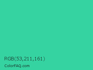 RGB 53,211,161 Color is a normal green color and the nearest color is Shamrock #33cc99. Hex code #35d3a1 and RGB value is rgb(53,211,161). In RGB color space, this color is composed of 21% red, 83% green, 63% blue, In CMYK color space, this color is composed of 75% cyan, 0% magenta, 24% yellow , 17% black , In HSL color space, this color has a hue angle of 161° , 64% saturation and 52% lightness.