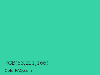 RGB 53,211,166 Color is a normal green color and the nearest color is Shamrock #33cc99. Hex code #35d3a6 and RGB value is rgb(53,211,166). In RGB color space, this color is composed of 21% red, 83% green, 65% blue, In CMYK color space, this color is composed of 75% cyan, 0% magenta, 21% yellow , 17% black , In HSL color space, this color has a hue angle of 163° , 64% saturation and 52% lightness.